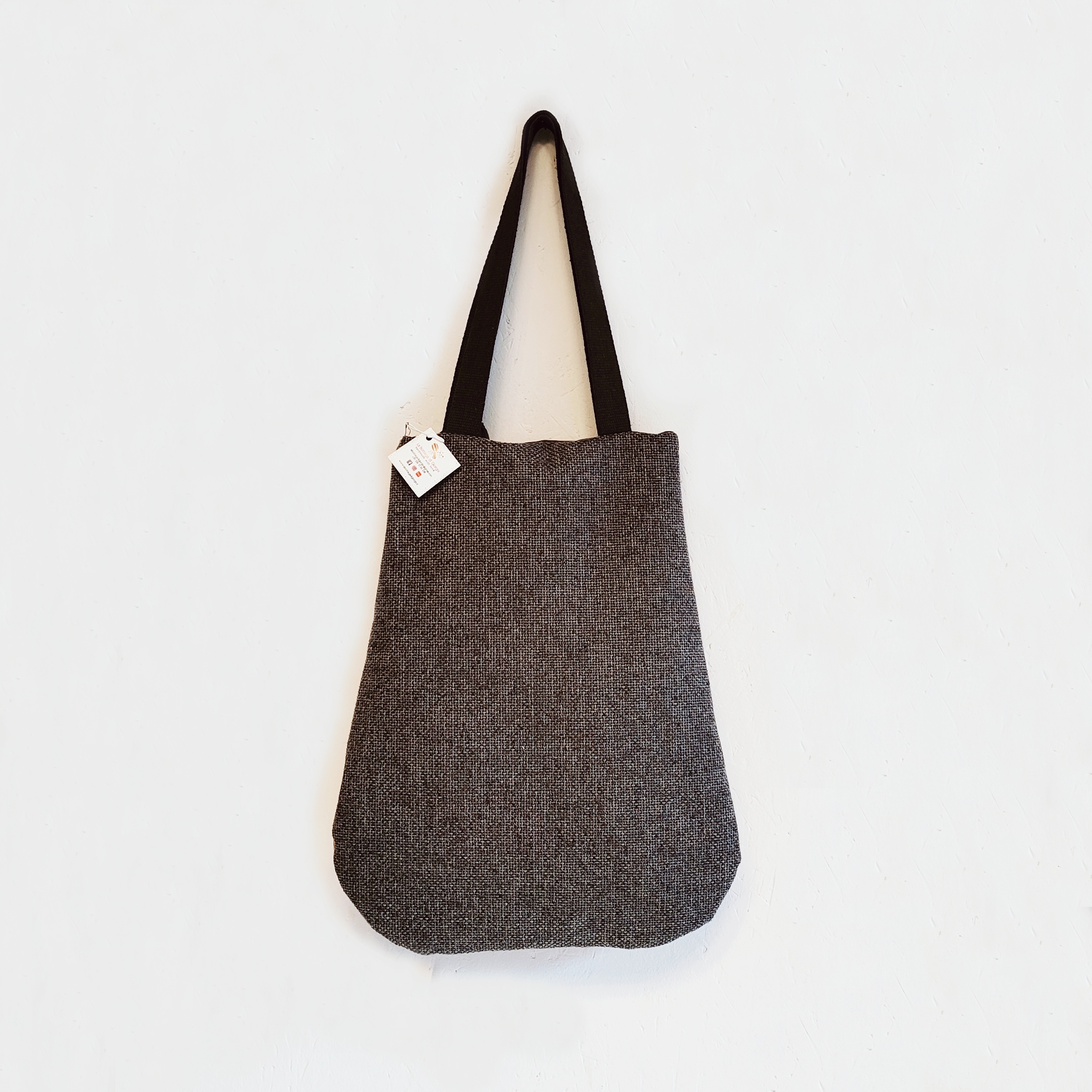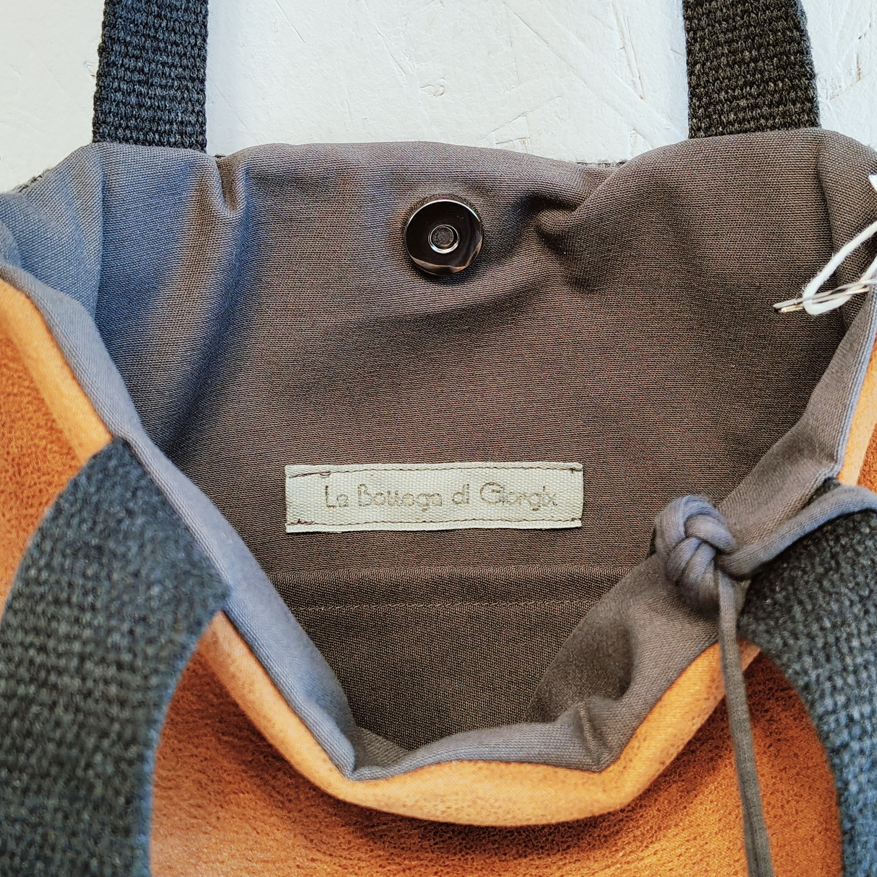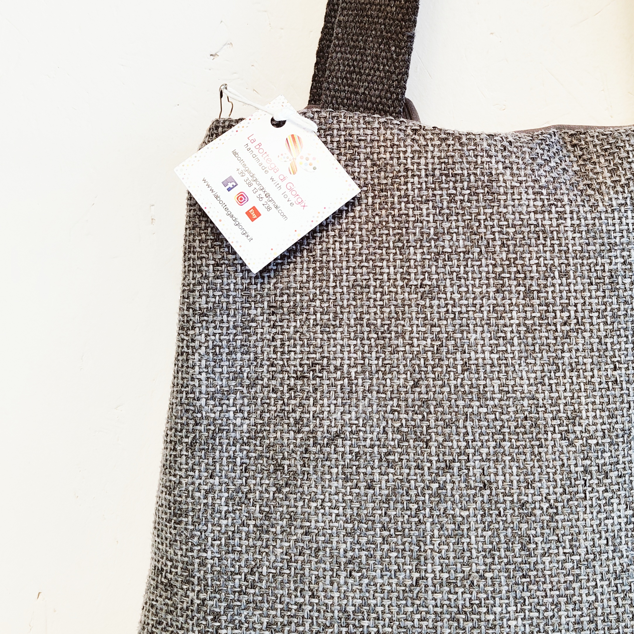 Borsa realizzata in tessuto resistente, con fodera in cotone, tasca portaoggetti e bottone a calamita.