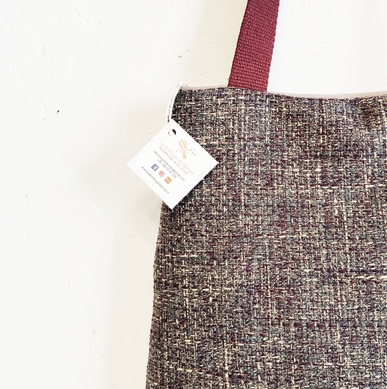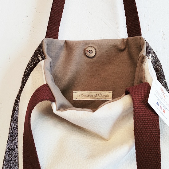 Borsa realizzata in tessuto resistente, con fodera in cotone, tasca portaoggetti e bottone a calamita.
