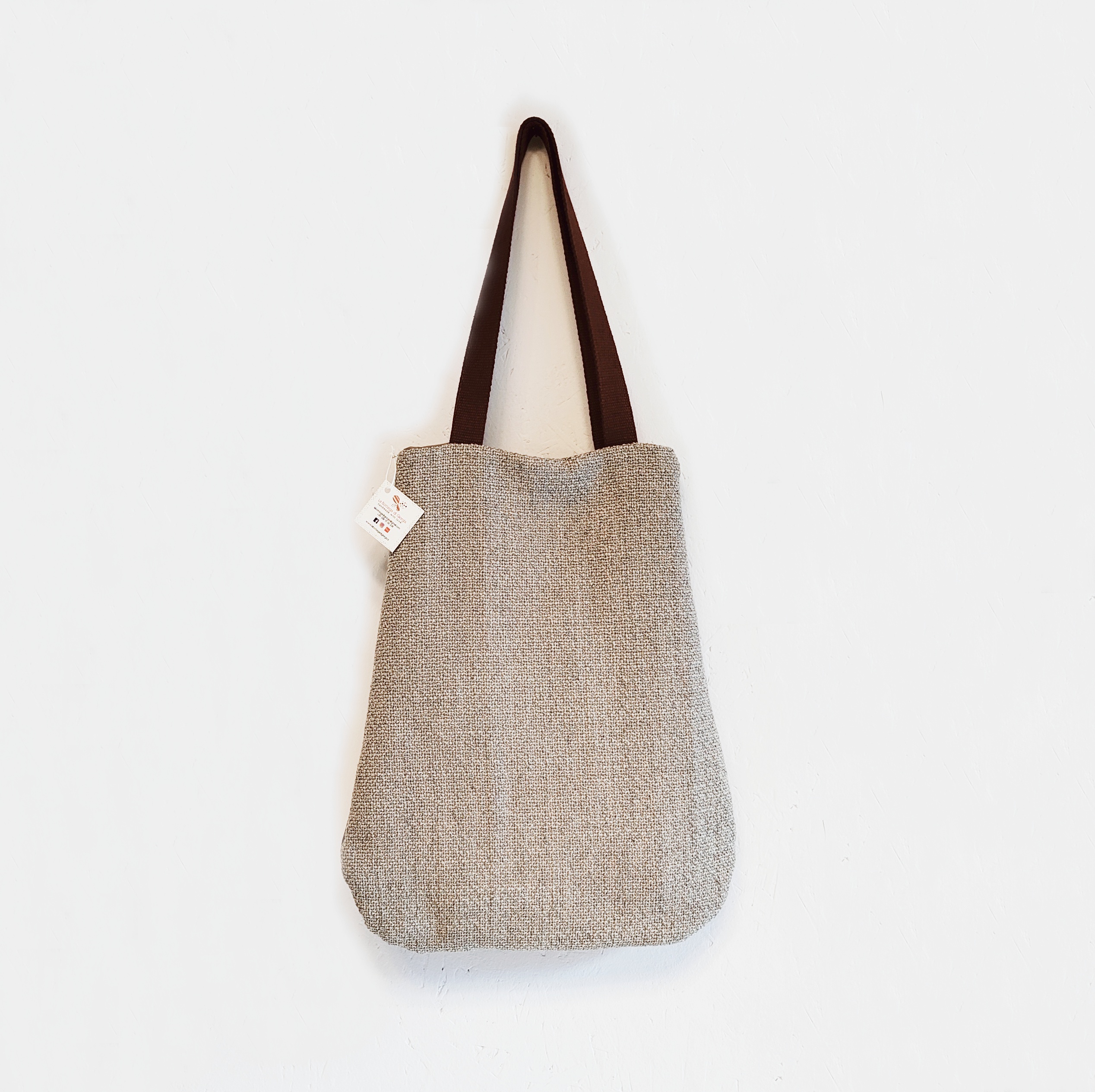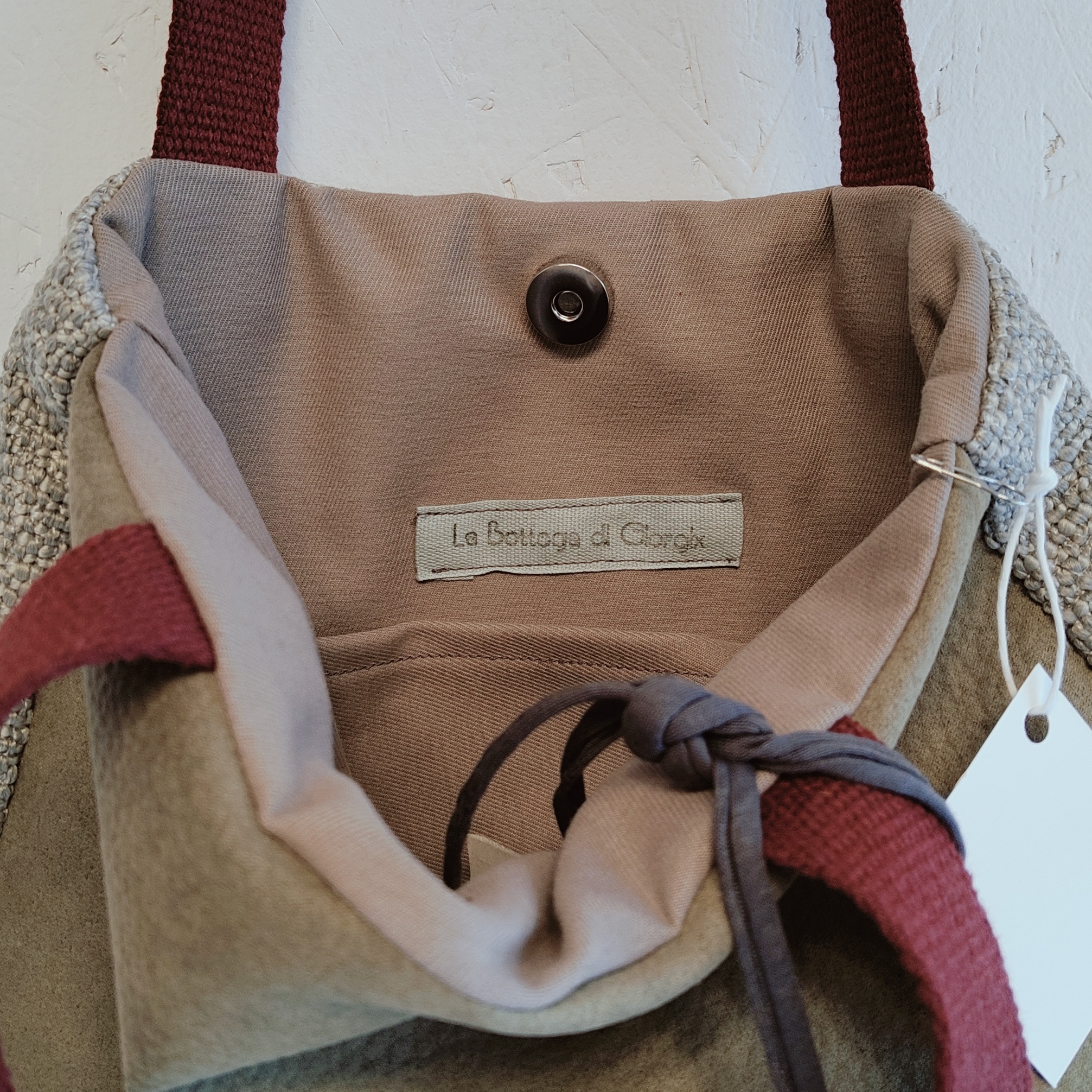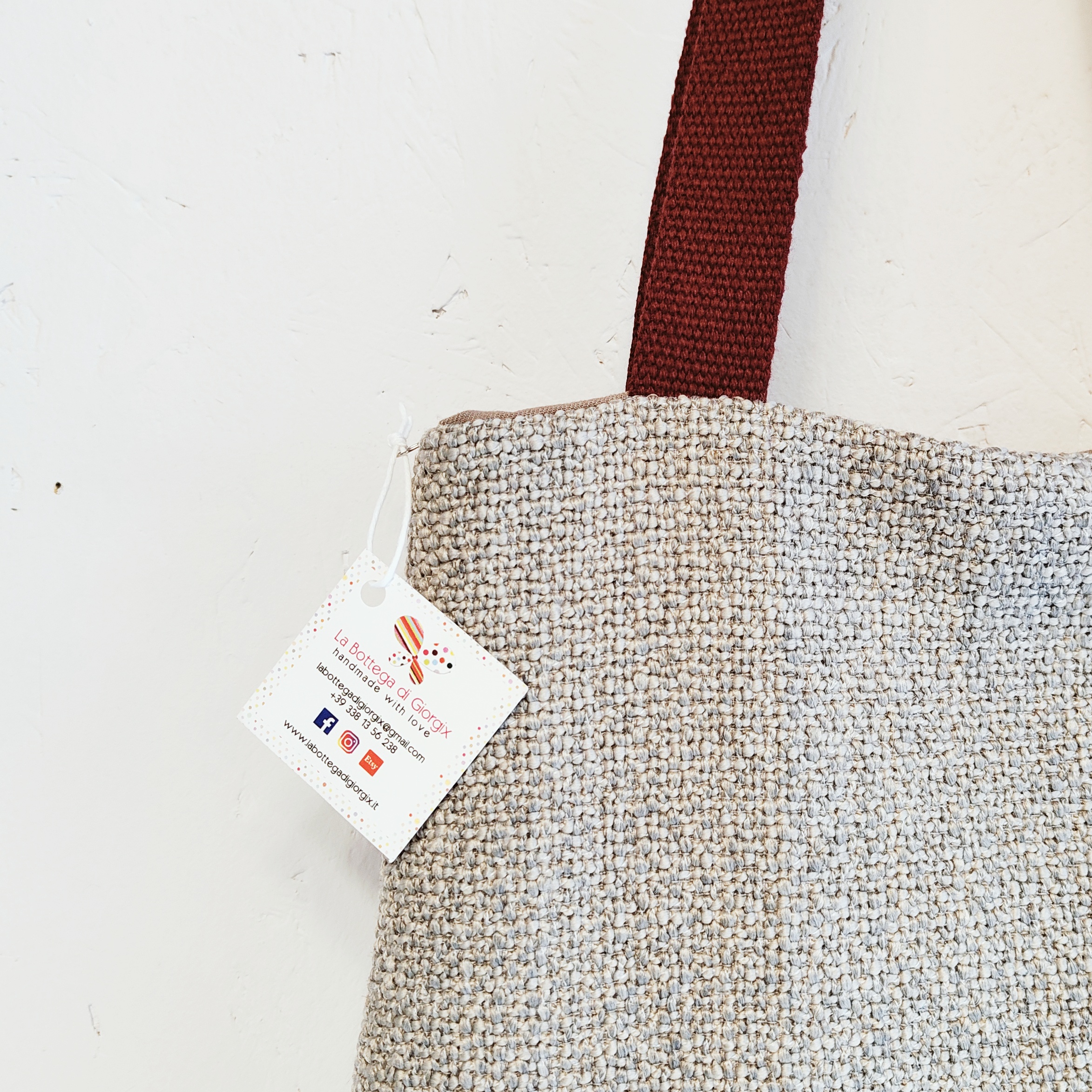 Borsa realizzata in tessuto resistente, con fodera in cotone, tasca portaoggetti e bottone a calamita.