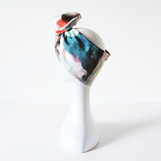 Fascia turbante modellabile in cotone garzato giapponese fondo bianco con fantasia verde, lilla, oro, cachi e rosa
